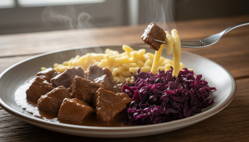 Als Begleiter dienen handgeschabte Spätzle und Rotkraut. Für die Spätzle werden 400 Gramm Mehl mit vier Eiern, einer Prise Salz und etwas Wasser zu einem zähen Teig verarbeitet. Dieser wird in kochendes Salzwasser gegeben. Das Rotkraut wird mit gehobelten Äpfeln, Zwiebeln und Nelken für 45 Minuten gedünstet. Ein Esslöffel Preiselbeeren rundet die Sauce des Gulaschs ab.