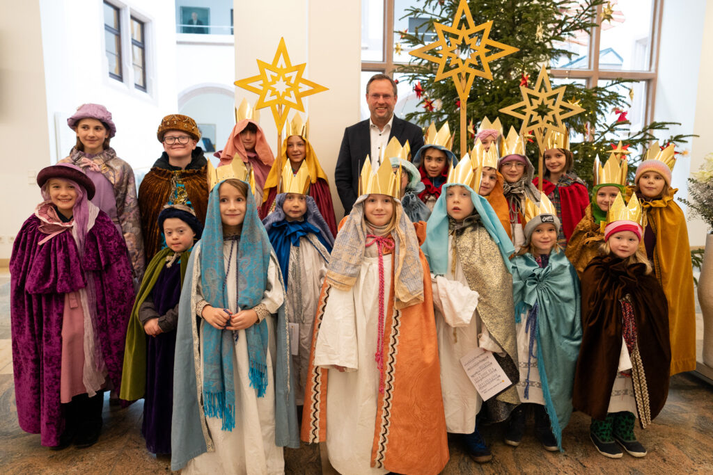 **Oberbürgermeister Martin Ansbacher hieß am Mittwochmorgen eine Delegation der Sternsinger im Foyer des Ulmer Rathauses willkommen. Im Mittelpunkt der diesjährigen 77. Aktion steht der Kampf gegen ausbeuterische Kinderarbeit unter dem Leitmotiv „Schule statt Fabrik“.**